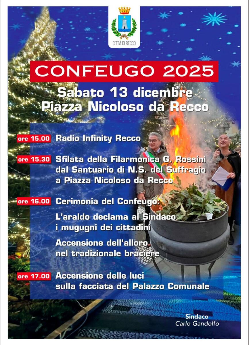 Sabato 13 dicembre, anche Recco rinnova l’antico rito del Confeugo in piazza Nicoloso. La tradizione ligure, nata nel XIV secolo, prevede l’accensione dell’alloro nel braciere mentre dalla direzione della fiamma che si innalza verso il cielo si traggono gli auspici per il nuovo anno. Il pomeriggio si aprirà alle ore 15 con l’animazione musicale di Radio Infinity Recco, seguita alle 15.30 dalla sfilata della Filarmonica G. Rossini, che partirà dal Santuario di Nostra Signora del Suffragio per raggiungere la piazza.
