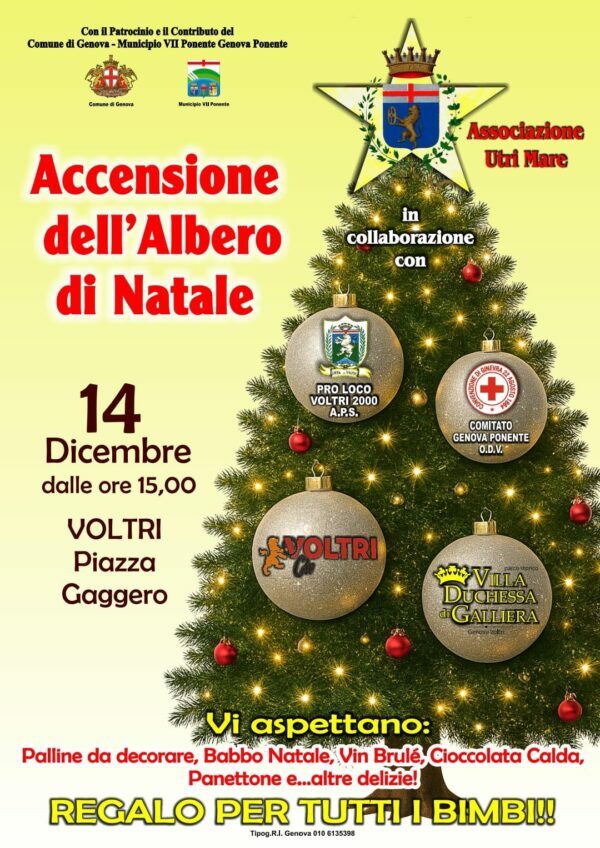 Domenica 14 dicembre, a partire dalle ore 15:00, Piazza Gaggero a Voltri ospiterà l’accensione dell’albero di Natale donato dal vivaio di Masone. L’iniziativa, organizzata da Associazione Utri Mare con Pro Loco Voltri, CIV di Voltri, Croce Rossa e Villa Duchessa di Galliera, con il coordinamento dell’Assessora Annalaura Ghigliotti e il patrocinio del Municipio 7 Ponente, celebra la Pace e la Fratellanza Universale.