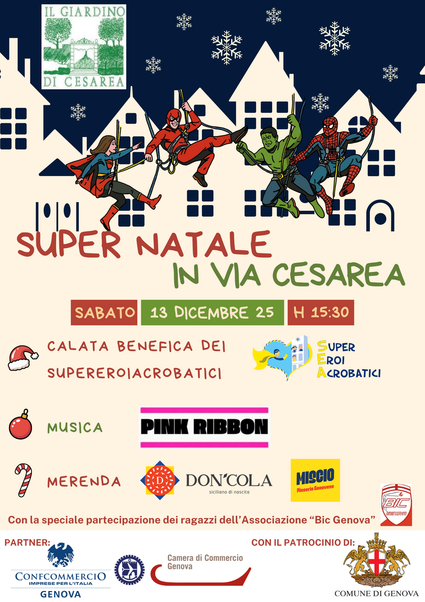 Sabato 13 dicembre 2025, dalle ore 15:30, il Giardino di Cesarea - CIV, insieme a Confcommercio Genova, Camera di Commercio di Genova e con il patrocinio del Comune di Genova, presenta “Super Natale in Via Cesarea”, un pomeriggio di festa, musica e solidarietà nel cuore della città.