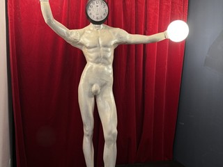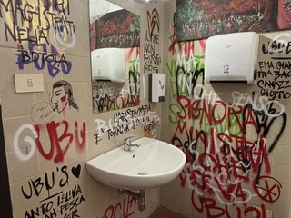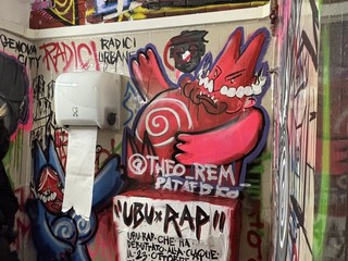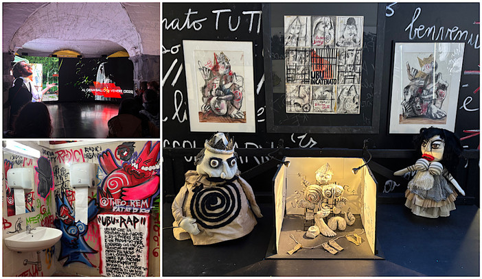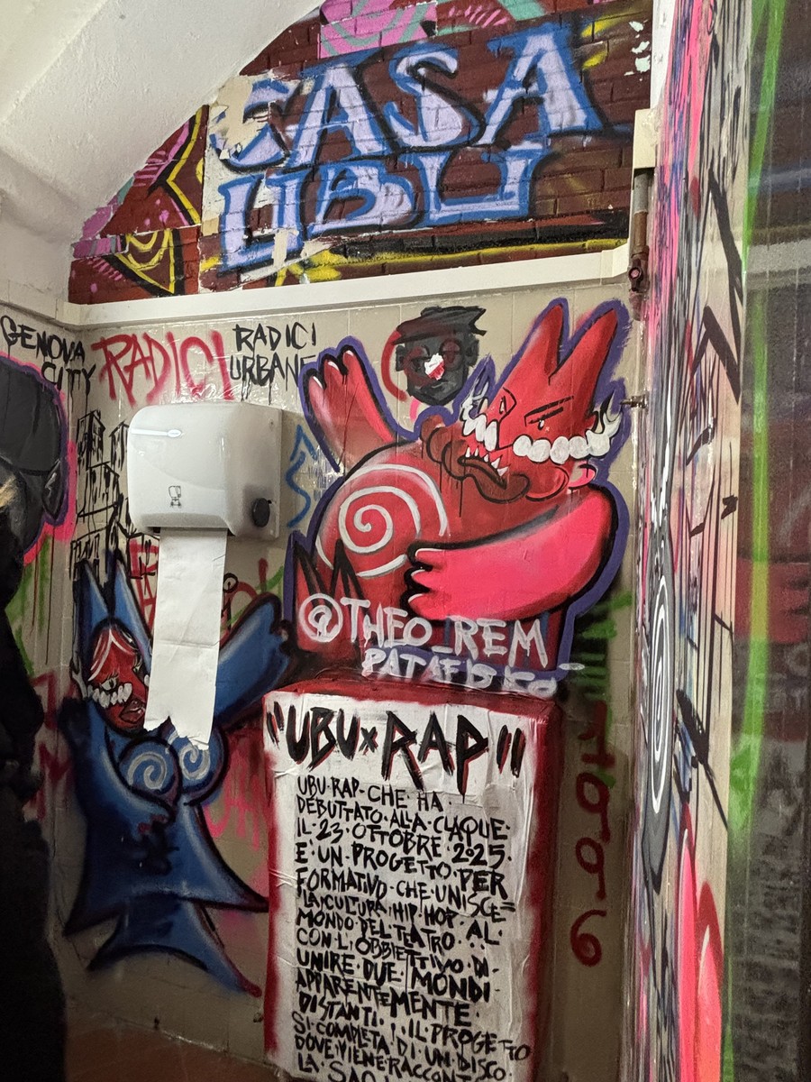 Elemento centrale della narrazione è Padre Ubù, il nume tutelare del teatro e simbolo di ironia, libertà e anarchia. Questo spirito alimenta la continua ricerca di contaminazione dei linguaggi. Ne è esempio il progetto "Ubu Rap" di Theo Rem (Matteo Di Blasi), che mette in dialogo la cultura hip hop con l’icona storica di Ubu, che è anche il logo del Teatro della Tosse. Ed è proprio Di Blasi a curare l’allestimento del bagno della Sala Munizioniere: “Il progetto Ubu Rap è un’operazione ambiziosa che prova a mettere in dialogo il mondo della cultura hip hop con quello del teatro, attraverso l’utilizzo del personaggio di Ubu. Ubu è un’icona del potere, da sempre usata per raccontare la quotidianità e i meccanismi di dominio che ci circondano; è un personaggio che esiste da oltre un secolo ed è anche il logo storico del Teatro della Tosse. Da qui è nata l’idea di una rivisitazione, coerente con il mio background legato alla cultura pop e all’ambiente hip hop. Io provengo da quel mondo e mi sono avvicinato al teatro in un secondo momento: questo progetto è, in fondo, un tentativo di unire due linguaggi che sento entrambi miei”, spiega. “Questo intervento all’interno della mostra è stato per me un grande onore, ed è chiaramente anche una provocazione, un gioco. Se nel rap c’è una forte componente musicale e di aggregazione, che in fondo accomuna hip hop e teatro, questo lavoro attinge molto anche all’estetica dei writer, degli spazi sociali, dei centri sociali: luoghi in cui sono cresciuto e dove ho avuto modo di entrare in contatto con culture alle quali, per il mio contesto sociale, forse non avrei avuto accesso altrove. Spazi che per me sono casa. Anche se possono apparire grezzi o sporchi, sono sempre stati una fonte di ispirazione. Portare questo mondo, spesso marginalizzato o letto solo attraverso una lente moralistica o legata alla legalità, dentro Palazzo Ducale, un’istituzione culturale di altissimo livello, in una sala così prestigiosa, è per me motivo di grande orgoglio”.