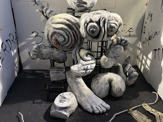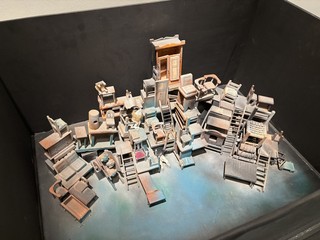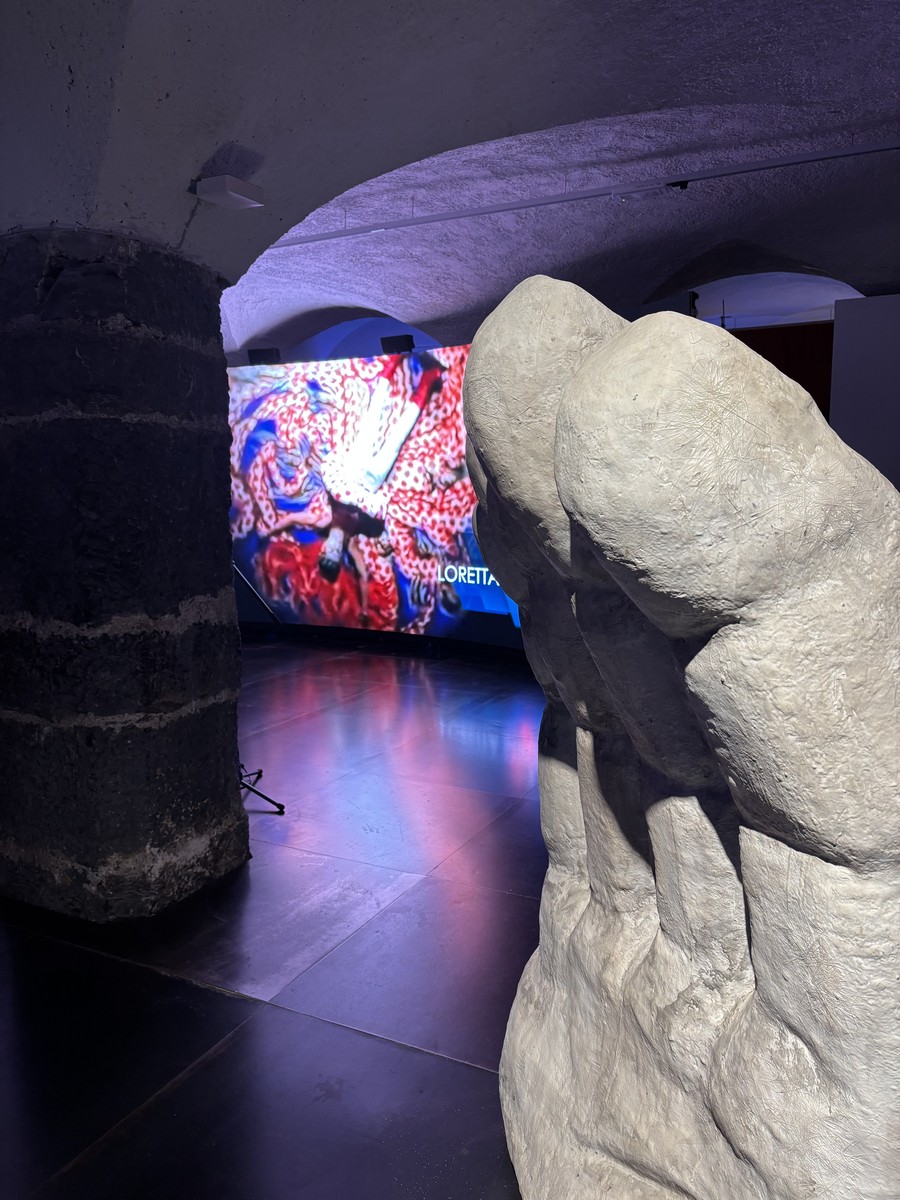 L’allestimento nasce anche dal recupero di elementi scenografici precedenti: in particolare dai resti murari della “casa di Ubu”, una grande scenografia documentata, utilizzata in una performance precedente, caratterizzata all’esterno da muri coperti di graffiti e scritte e all’interno dallo spazio domestico di Ubu. “Da qui è nata, insieme ad Alessio Aronne, l’idea di portare quell’allestimento all’interno della mostra. Dal momento che si voleva esporre anche il materiale grafico e le tavole utilizzate per l’immaginario visivo, mi è stato proposto di allestire uno spazio dedicato. Abbiamo pensato simbolicamente al bagno, proprio per mantenere il legame con le subculture, l’underground, tutto ciò che nasce “dal basso”. Un’idea coerente con lo spirito del progetto e con il percorso che rappresenta”.