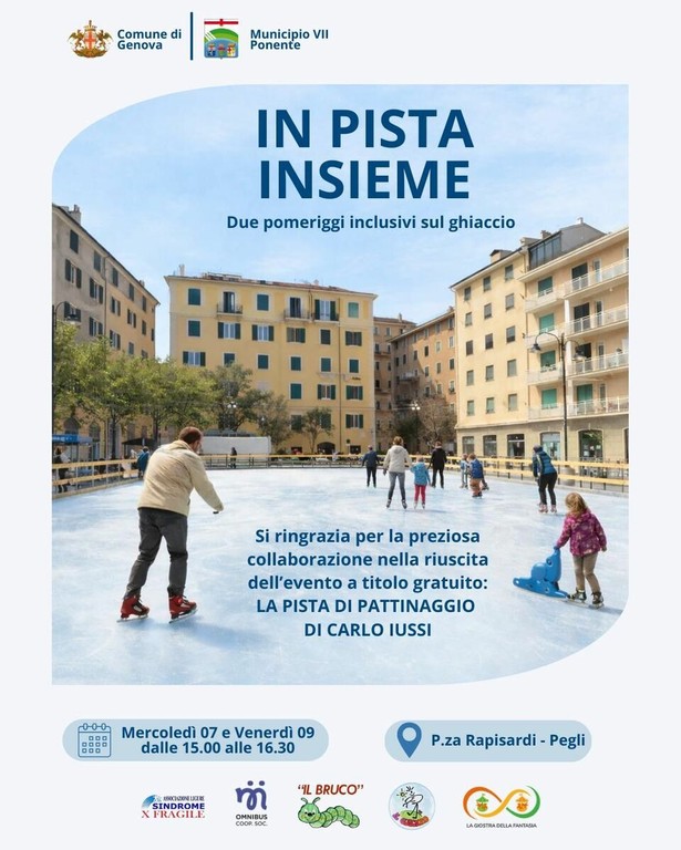 A coordinare l’evento è Annalaura Ghigliotti, assessora municipale con delega all’Associazionismo: “Con ‘In pista insieme’ - afferma - vogliamo dare un segnale semplice ma concreto di inclusione e di attenzione alle persone con disabilità e alle loro famiglie. Grazie alla disponibilità del gestore della pista di pattinaggio di Pegli, Carlo Iussi, che ringraziamo di cuore, al lavoro condiviso con le associazioni e cooperative del territorio - Omnibus, Il Bruco, Il Cucciolo, Associazione X Fragile e La Giostra della Fantasia - e al fattivo contributo della consigliera municipale Rossella Stradella, siamo riusciti a costruire due pomeriggi accessibili e gratuiti, pensati come momenti di socialità e partecipazione. È un esempio di come il Municipio possa fare rete, valorizzando le energie presenti sul territorio e trasformando la collaborazione in opportunità reali per la comunità”.