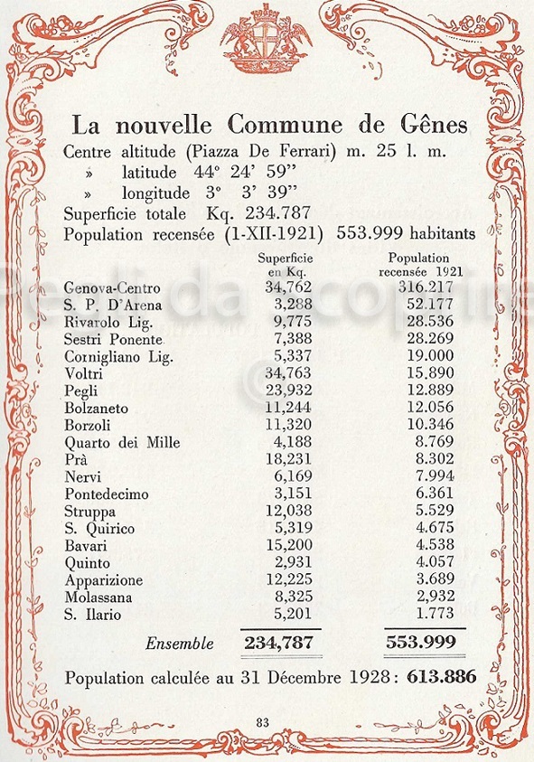 245.000 abitanti si aggiungono ai 335mila, quartieri operai e balneari per potenziare porto e ANSALDO. L’operazione salda in un unico comune l’arco costiero da Voltri a Nervi e risale le vallate fino a Pontedecimo e Struppa, tutti sotto un unico podestà.