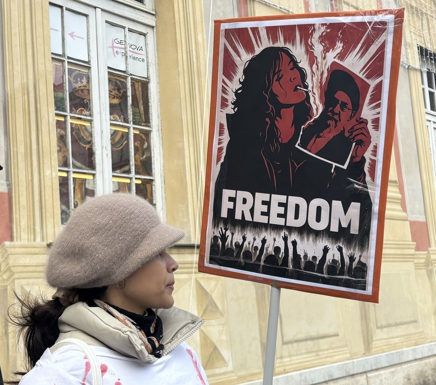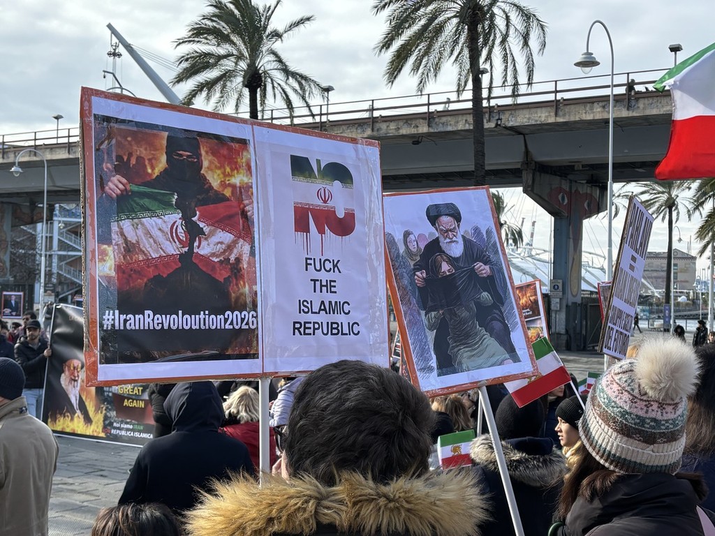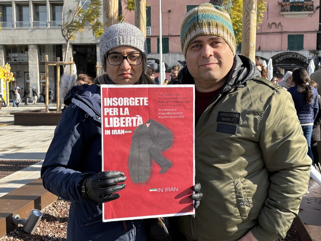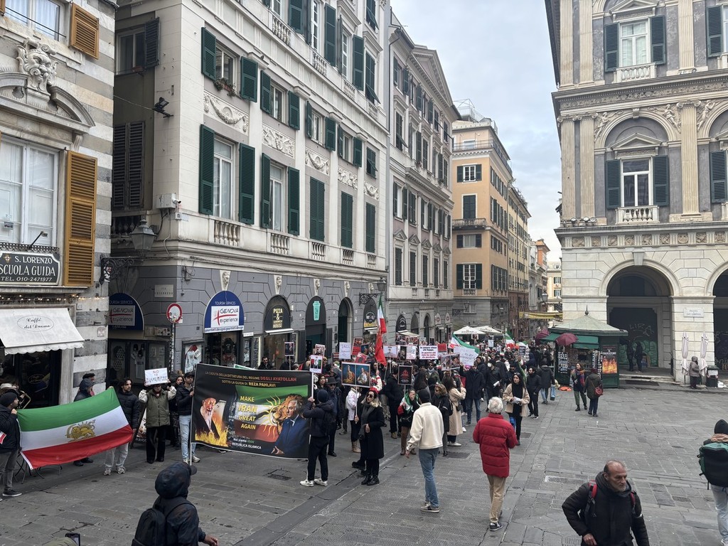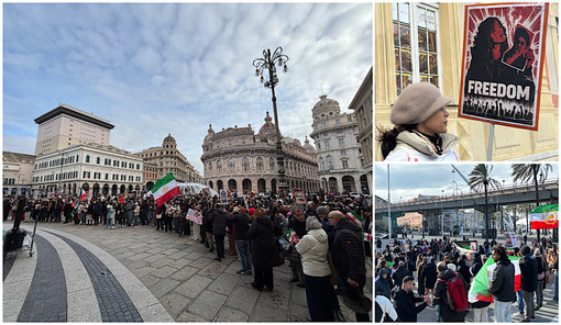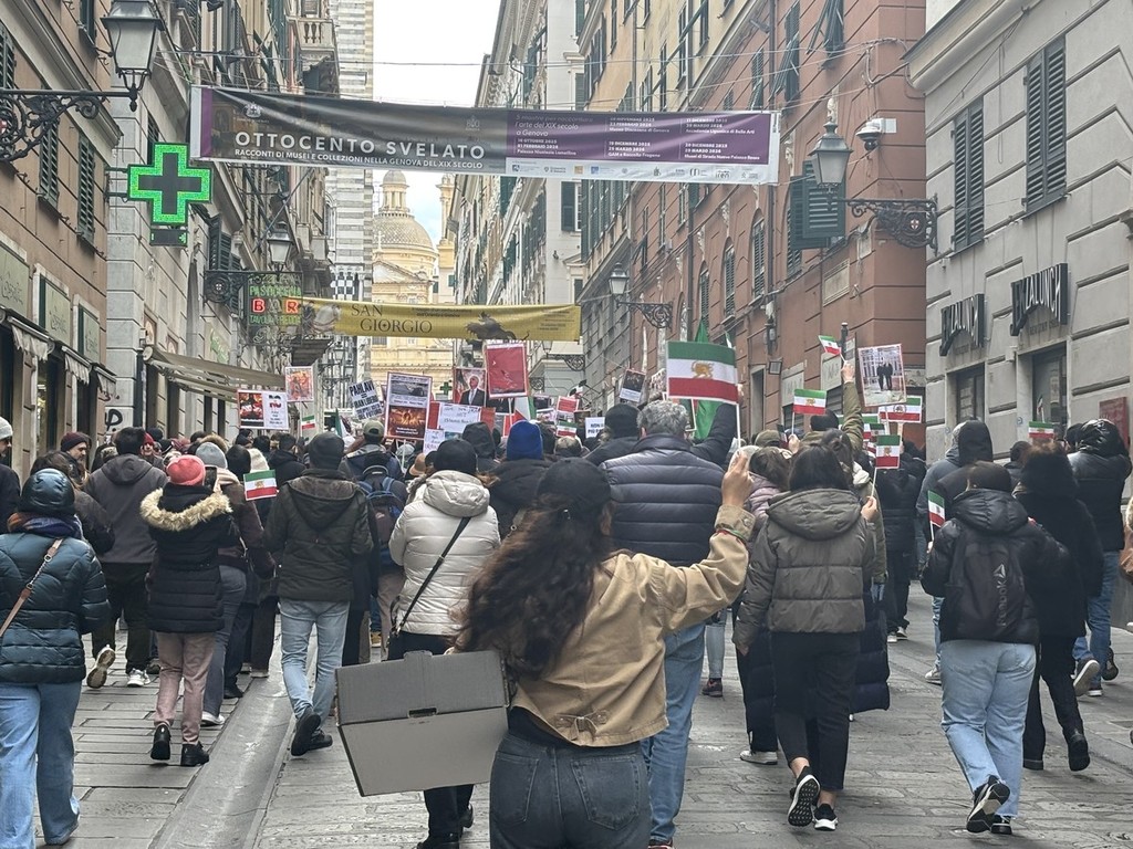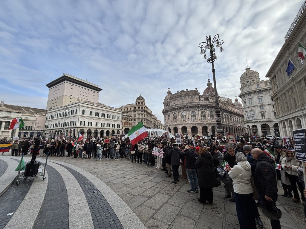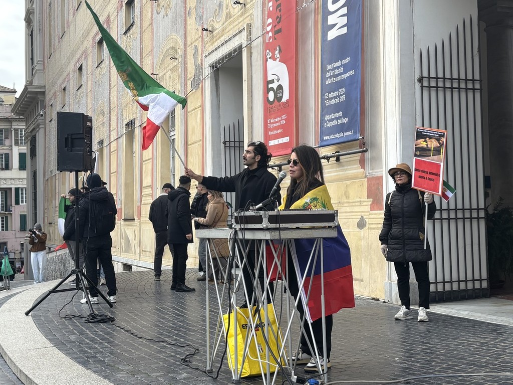 Quella in atto in Iran non viene definita dai manifestanti come semplice repressione, ma come un vero e proprio genocidio e un crimine contro l’umanità: “Ciò che oggi accade in Iran non è repressione. Il suo vero nome è crimine contro l’umanità e genocidio. Un regime che spara contro civili indifesi nelle strade, che uccide i feriti persino nei letti d’ospedale, che seppellisce i corpi in segreto, che arresta, fa sparire e tortura migliaia di persone, e che, oscurando internet, intimidendo i testimoni e nascondendo la verità, tenta di sottrarre i propri crimini allo sguardo del mondo, sta commettendo crimini contro l’umanità” spiega un’attivista dal palco allestito sui gradini di Palazzo Ducale. “Questa non è un’opinione politica: è una definizione chiara e precisa del diritto internazionale. Ma ciò che sta avvenendo in Iran va oltre il crimine contro l’umanità. Quando un governo, o meglio, un regime, considera il proprio popolo, colpevole solo di chiedere libertà e dignità umana, come un nemico esistenziale; quando lo disumanizza e crea sistematicamente le condizioni per la sua distruzione, allora ci troviamo di fronte a un genocidio. La giovane generazione iraniana è bersaglio dei proiettili. I bambini sono vittime di una violenza organizzata. Le famiglie vengono distrutte e la continuità di un’intera generazione è deliberatamente presa di mira. Da oltre 300 ore internet è interrotto in Iran. Il Paese è precipitato nel silenzio e nell’oscurità, e in questa oscurità il massacro continua. Interrompere le comunicazioni significa eliminare i testimoni, ed eliminare i testimoni significa facilitare il compimento del crimine”.
