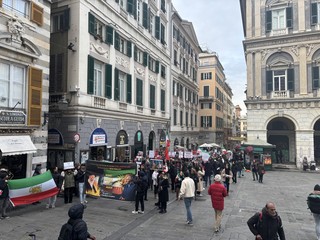 “Il mondo guarda, il regime massacra”, “Meloni scegli la parte giusta”. Questi sono solo alcuni degli slogan della “Marcia per la Libertà”, la manifestazione di protesta organizzata dalla comunità iraniana che ha radunato centinaia di persone questa mattina in piazza Caricamento. Gli attivisti si sono radunati alle 12 per poi muoversi in direzione di via San Lorenzo e arrivare in piazza De Ferrari.