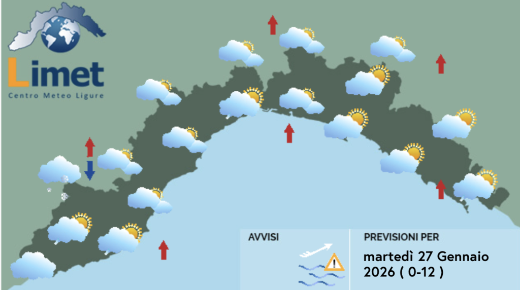 Ecco le previsioni meteo per oggi, martedì 27 gennaio, a cura di Limet Liguria.