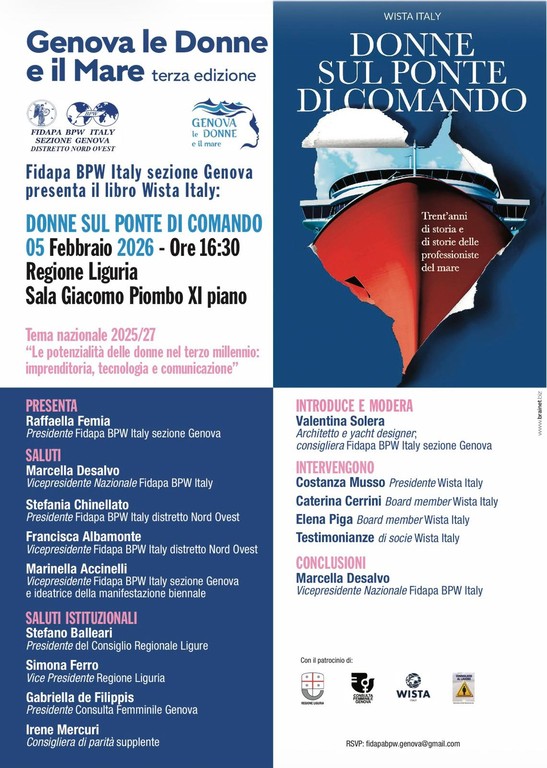 La presentazione dell’evento sarà moderata da Valentina Solera, architetto, yacht designer e consigliera Fidapa BPW Italy sezione Genova, che guiderà il dibattito con le relatrici per esplorare i temi della leadership femminile e della coesione di genere nello shipping e nella Blue Economy. All’incontro parteciperanno anche Stefania Chinellato, Presidente Fidapa BPW Italy distretto Nord Ovest, Francisca Albamonte, vicepresidente di FIDAPA BPW Italy distretto Nord Ovest, Costanza Musso, Presidente WISTA Italy, Caterina Cerrini ed Elena Piga, board member Wista Italy, oltre a testimonianze di socie WISTA, professioniste che hanno contribuito alla costruzione del volume e del network.