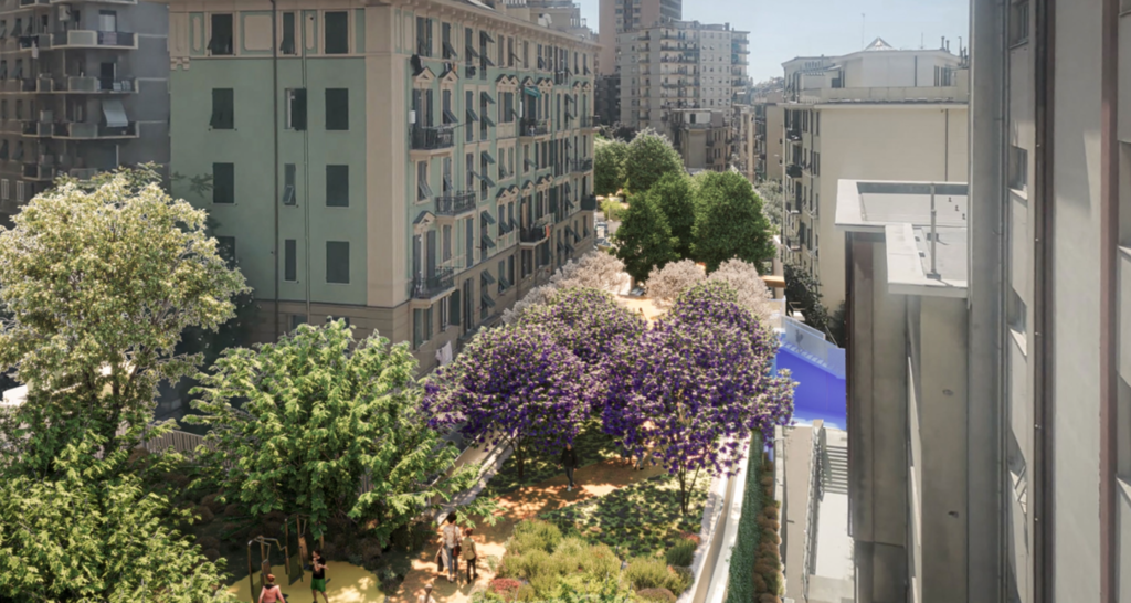 All’estremità di ponente è prevista la riattivazione del campo sportivo esistente, che diventa il fulcro di un sistema più ampio di nuovi spazi dedicati all’attività motoria e al fitness. L’intervento è progettato in stretta sinergia con i futuri spazi per attività pubbliche e collettive, destinati a trovare collocazione negli edifici circostanti. In quest’ottica, i progettisti hanno già valutato le possibili funzioni degli immobili che saranno acquisiti al termine della procedura espropriativa, verificandone la compatibilità con il contesto urbano. Tra le destinazioni ipotizzate figurano spazi per la cultura e il lavoro, come aree di co-working, strutture dedicate allo sport e al benessere come palestre e ambienti per l’attività motoria o riabilitativa, oltre a luoghi pensati per la vita e le attività della comunità.