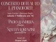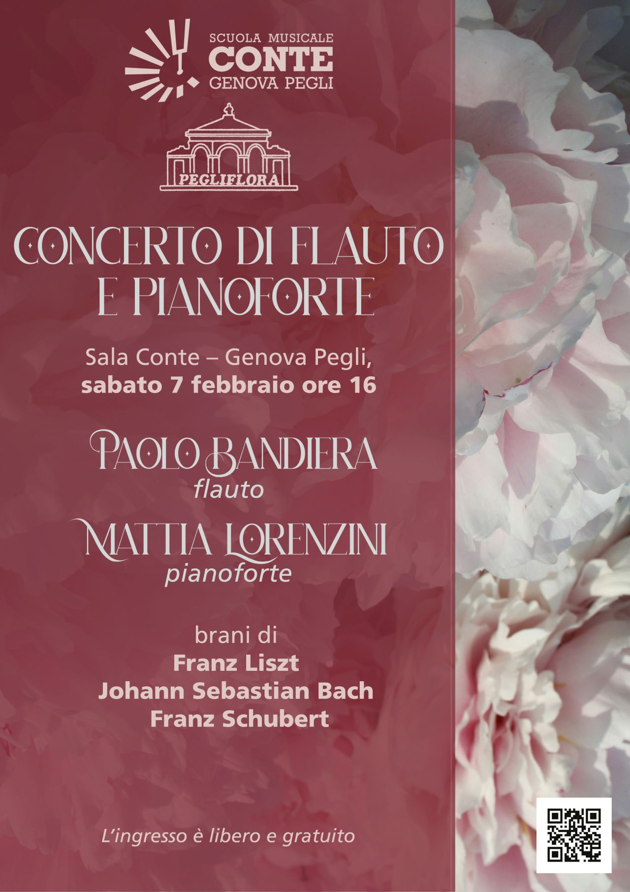Nel frattempo, proseguono gli incontri alla Sala Conte, l’auditorium della Scuola Musicale in via Cialli 6D a Pegli. Sabato prossimo, 7 febbraio, alle ore 16, in collaborazione con l’associazione Pegliflora, concerto di flauto e pianoforte con Paolo Bandiera al flauto e Mattia Lorenzini al pianoforte. L’ingresso è libero e gratuito.