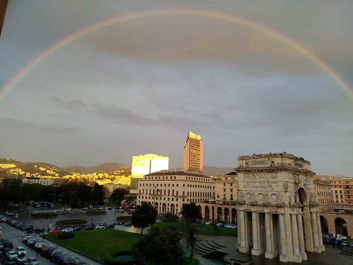 Dopo la pioggia, ecco Genova abbracciata dall'arcobaleno.