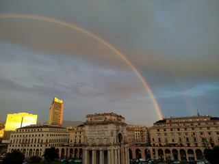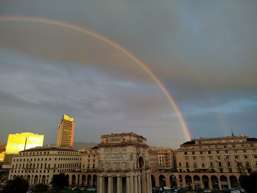 Così, non appena nel cielo genovese è spuntato un timido sole, ecco arrivare sulla città l'arco colorato che affascina grandi e piccini.