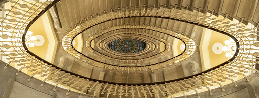 Disegnata dall’architetto Dario Carbone e realizzata nel 1905, la scala è il fulcro di tutto l’edifico collegandone i sei piani.