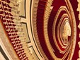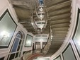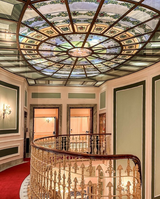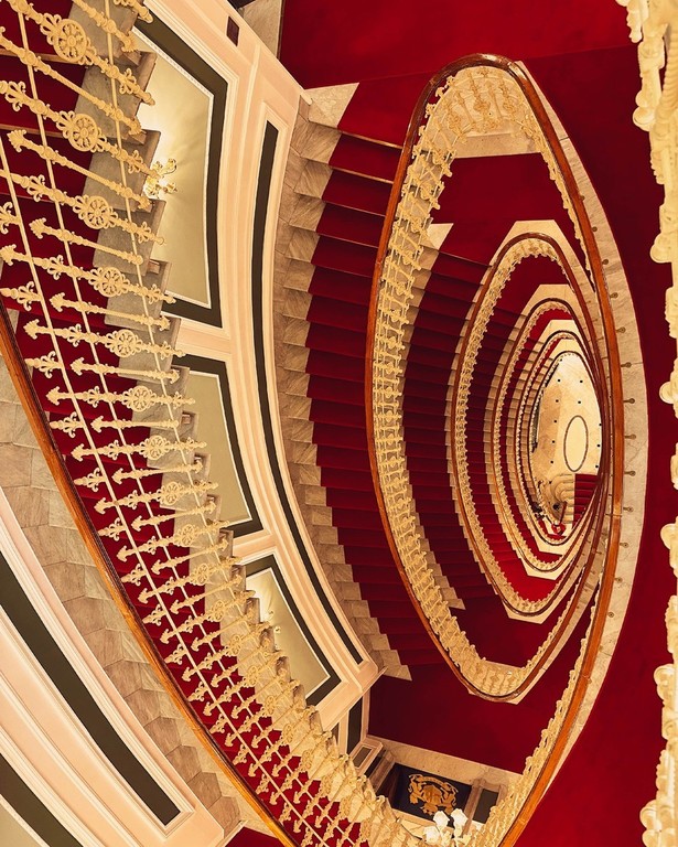 I gradini, bassi e ampi, sembrano pensati per l’incedere elegante mentre le ringhiere in ferro battuto sono impreziosite da un ‘ricamo’ floreale: volute, foglie, linee morbide che seguono il movimento della scala. Attorno, stucchi, dorature, lampadari, vetrate: tutto riflette la luce sul bianco lucidissimo, amplificando l’effetto.