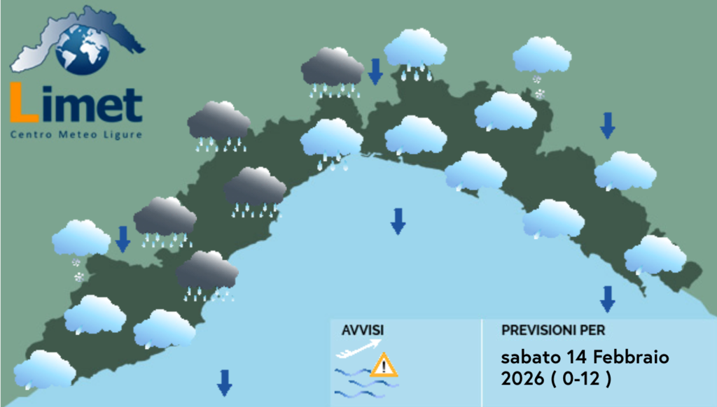 Un’intensa e veloce perturbazione interesserà la Liguria nella giornata di sabato 14 con piogge anche intense e venti forti. Deciso miglioramento domenica e variabilità lunedì.