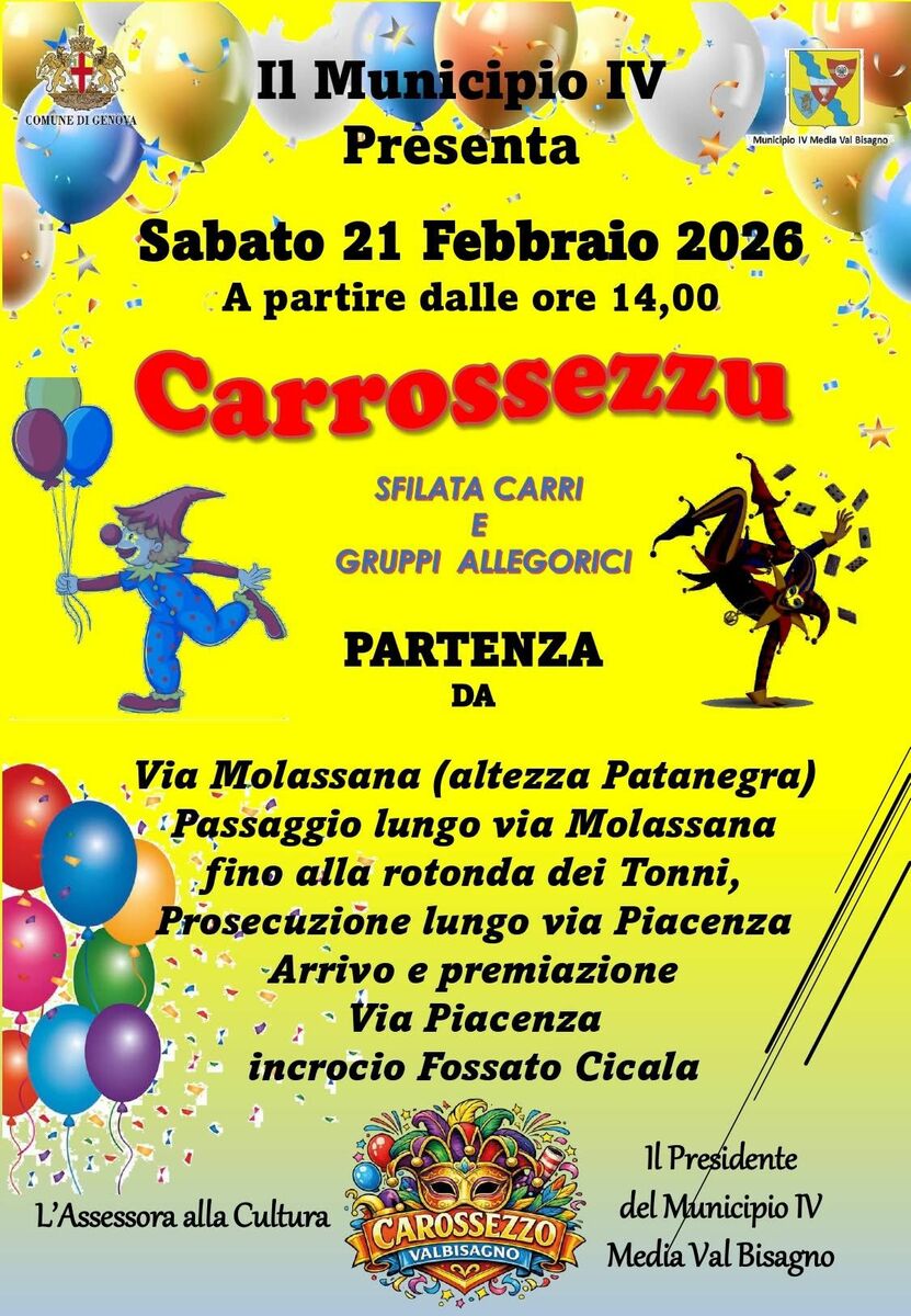 Torna uno degli appuntamenti più attesi della vallata. Sabato 21 febbraio 2026, a partire dalle ore 14.00, il Municipio IV Media Val Bisagno riporta in strada il “Carrossezzu”, la storica sfilata di carri e gruppi allegorici che ogni anno richiama famiglie, scuole e residenti lungo le principali arterie del quartiere.