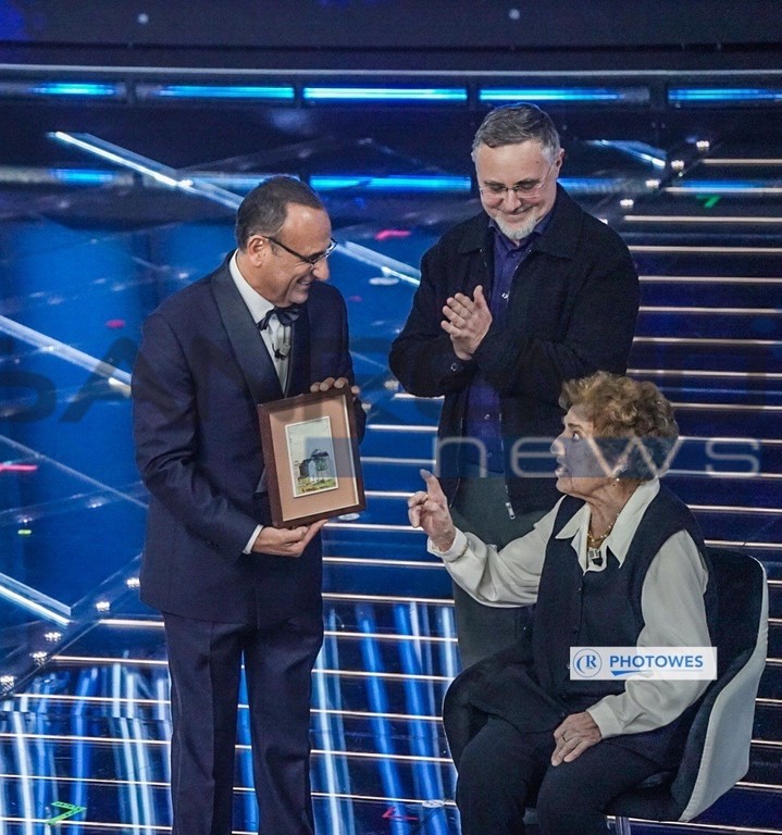 Affacciandosi al palco, ricevendo l’applauso del pubblico, Pratesi ha esclamato ‘Quanta gente eh’ prima di regalare a Carlo Conti un quadro dipinto da lei.