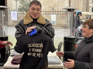 Su tutti, la maglietta ‘Sciuscia e sciurbì nu se peu’ che una signora ha deciso di omaggiare al giovane cantante.