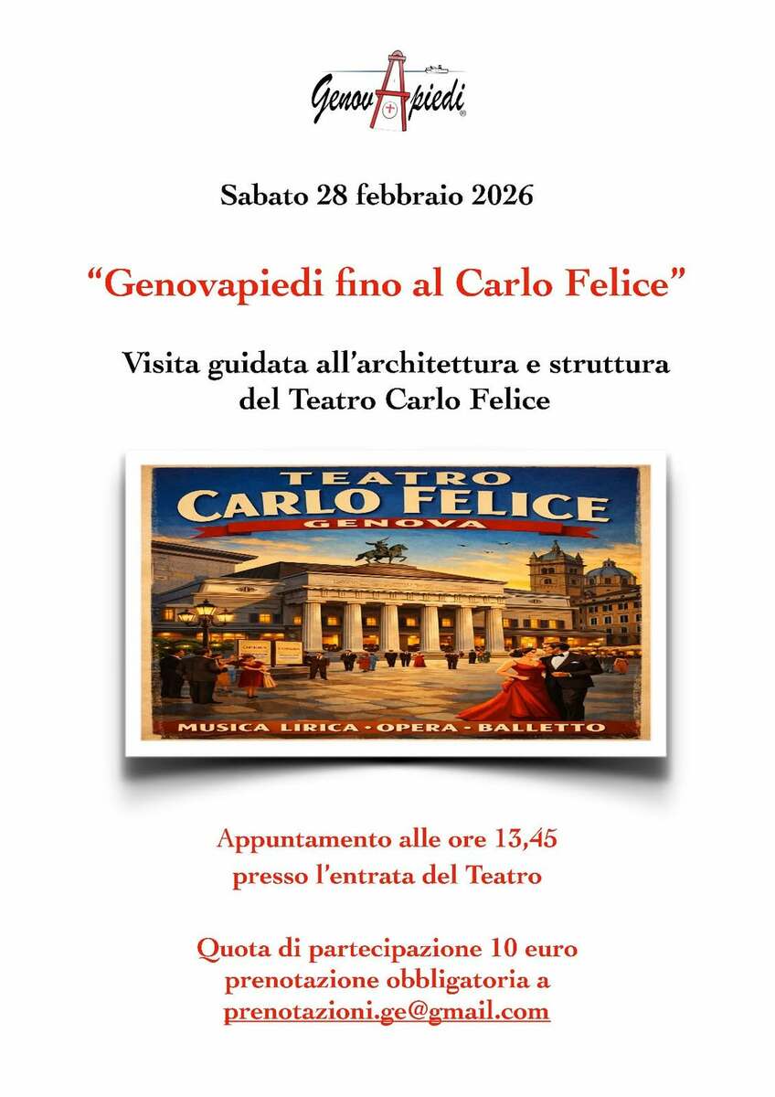 Sabato 28 febbraio 2026 alle 13.45 appuntamento davanti all’ingresso del Teatro Carlo Felice (passo Eugenio Montale 4) per “Genovapiedi fino al Carlo Felice”, visita guidata dedicata alla storia, all’architettura e alla struttura del principale teatro lirico cittadino. La partecipazione costa 10 euro ed è obbligatoria la prenotazione via mail a prenotazioni.ge@gmail.com.