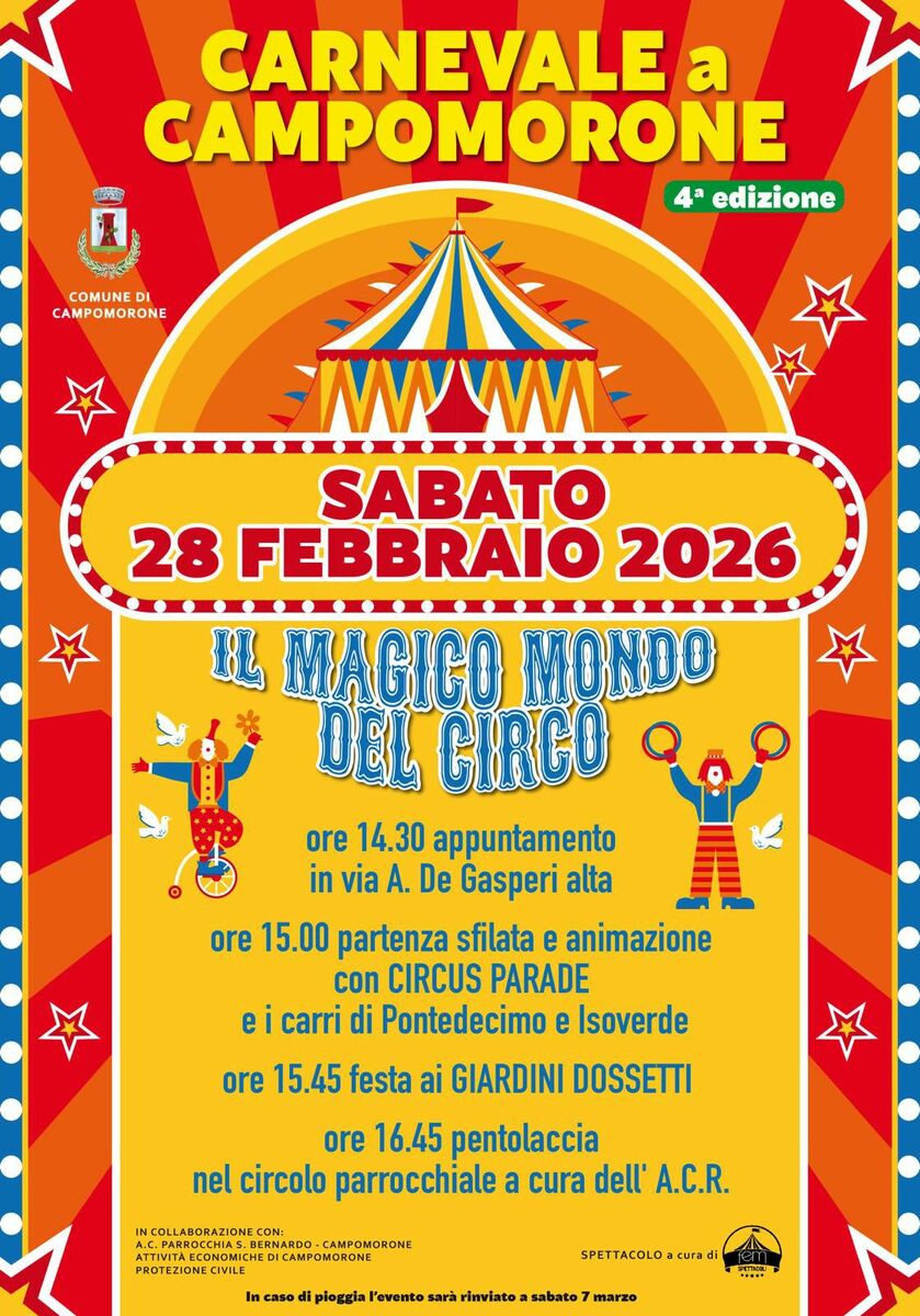 Sabato 28 febbraio 2026 il Comune di Campomorone celebra il Carnevale con una festa diffusa che coinvolge tutto il paese. Ritrovo alle 14.30 in via A. De Gasperi alta, quindi partenza della sfilata animata da “Circus Parade – Il magico mondo del circo” a cura di Fem Spettacoli, insieme ai carri allegorici del Parco Giochi Isoverde e del Ricreatorio “S. Luigi” di Pontedecimo.
