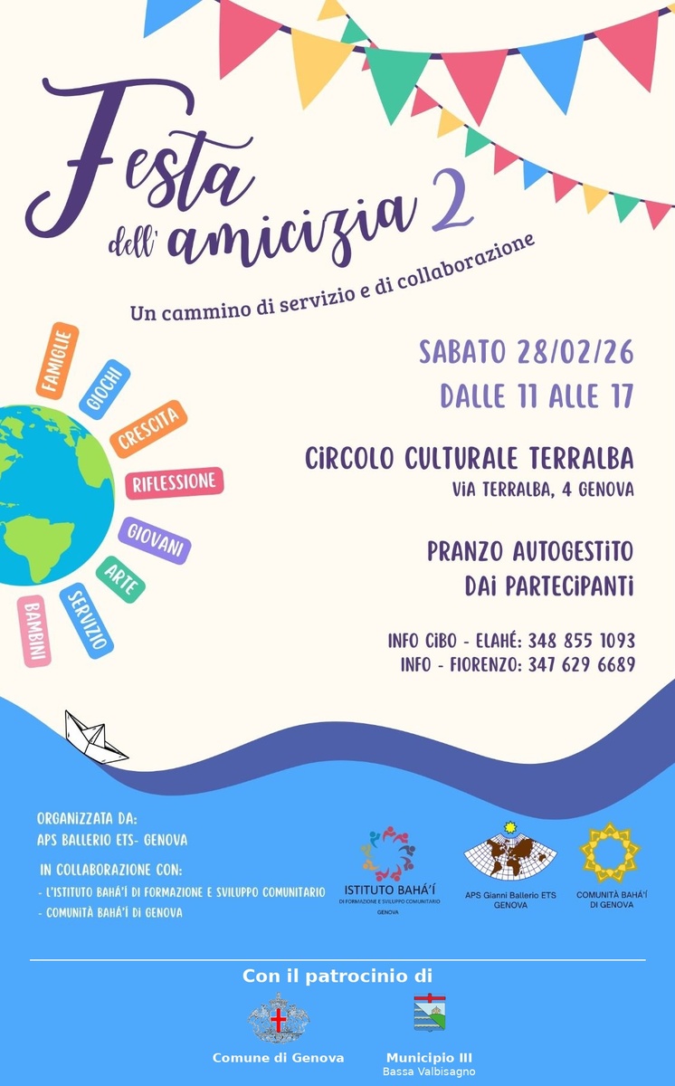 Sabato 28 febbraio 2026, dalle 11 alle 17, al Circolo Culturale Terralba (via Terralba 4), si terrà la “Festa dell’Amicizia 2 – Un cammino di servizio e collaborazione”, iniziativa promossa dalla Ballerio ETS di Genova nell’ambito di un programma pluriennale di sviluppo territoriale orientato alla costruzione di comunità nel Municipio III – Bassa Val Bisagno.