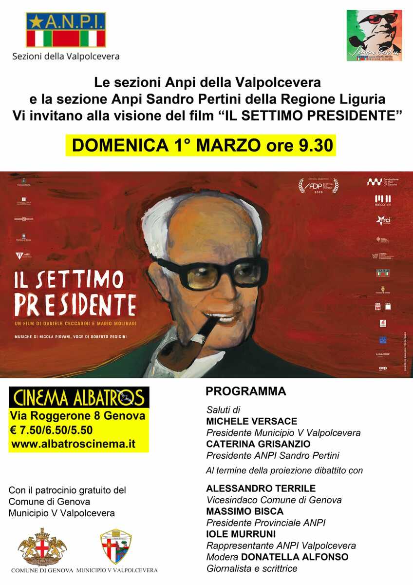 Domenica 1° marzo alle 9.30 al Cinema Albatros (via Roggerone 8, Rivarolo) le sezioni ANPI della Valpolcevera e la sezione “S. Pertini” promuovono la proiezione de Il Settimo Presidente, dedicato a Sandro Pertini nel 130° anniversario della nascita. Il docufilm ripercorre la vita del presidente, dalla militanza socialista e partigiana al settennato negli anni di piombo, con musiche di Nicola Piovani e voce narrante di Roberto Pedicini.