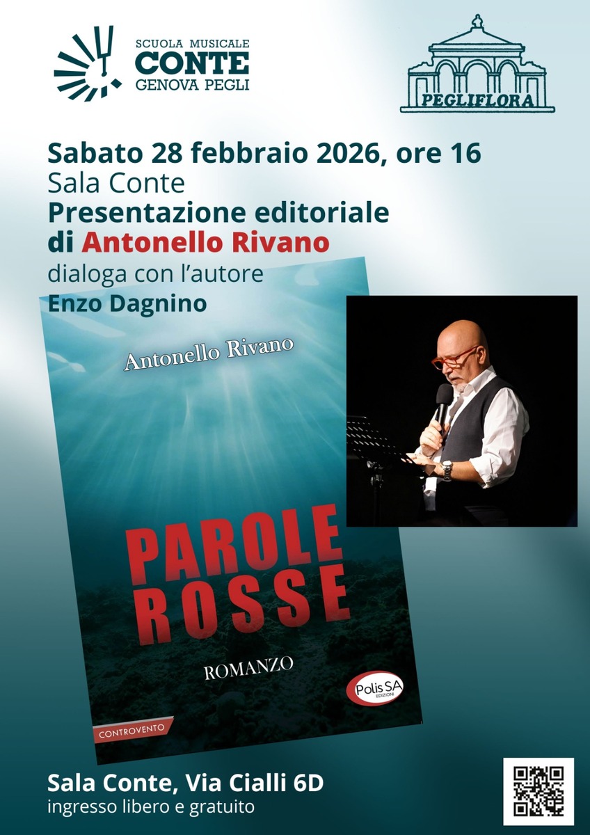 Sabato 28 febbraio 2026 alle 16 alla Sala Conte (via Cialli 6D) di Genova Pegli, nell’ambito degli Incontri organizzati dalla Scuola Musicale Giuseppe Conte in collaborazione con Pegliflora, sarà presentato “Parole rosse” (Polis SA Edizioni, 2025), nuovo romanzo di Antonello Rivano. Ingresso libero. Il libro racconta la storia di Riky, cantante segnato dalla scomparsa di Gloria, in un viaggio tra Milano, Genova e un’isola mediterranea, tra mistero, introspezione e suspense, affiancato da due investigatori fuori dagli schemi.