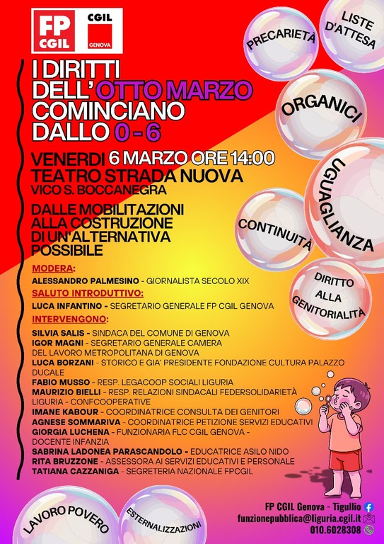Un momento di confronto pubblico, ma anche un passaggio politico dentro il percorso di mobilitazione già avviato nelle scorse settimane. Si intitola “I diritti dell’8 marzo cominciano dallo zero-sei” l’iniziativa organizzata dalla Funzione Pubblica Cgil di Genova in vista della Giornata internazionale della donna.