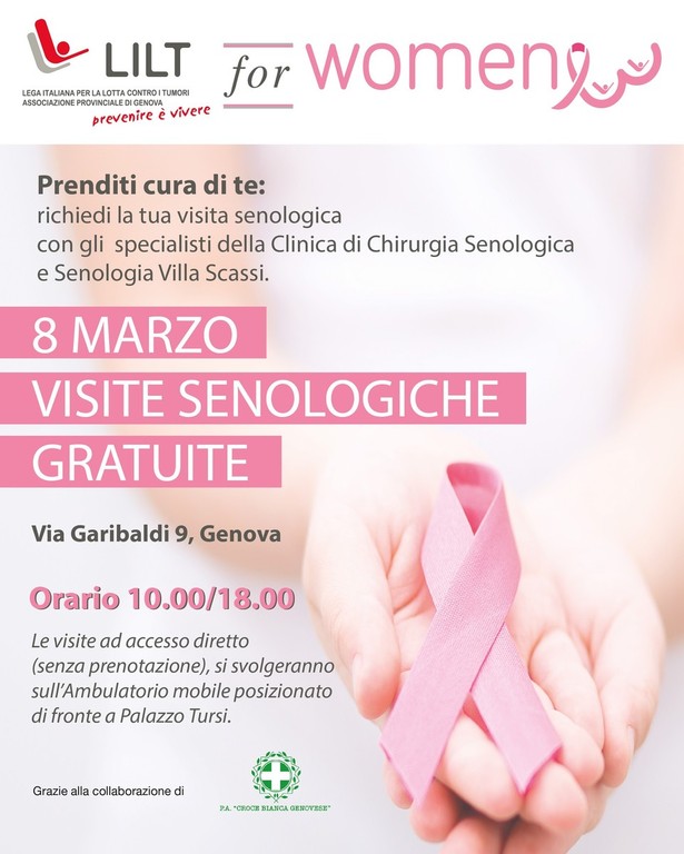 In occasione della Giornata Internazionale della Donna, LILT – Lega Italiana per la Lotta contro i Tumori, Sezione Provinciale di Genova, e il Comune di Genova portano la prevenzione oncologica direttamente tra le strade e gli uffici cittadini. Due giornate dedicate alla salute femminile, con visite senologiche gratuite offerte alle donne senza necessità di prenotazione.