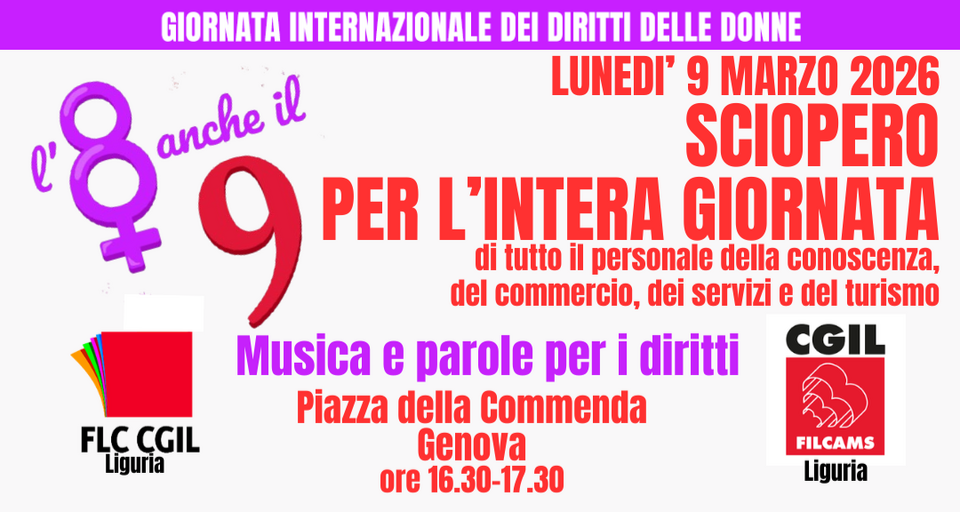 Filcams Cgil e Flc Cgil Liguria lunedì 9 marzo, aderiscono alla manifestazione R-Esistenze, con concentramento alle ore 18 a Genova in via Fanti d’Italia a Genova.
