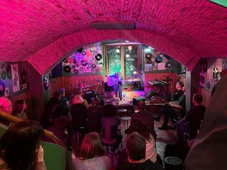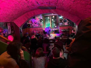 Appena varcata la soglia, a dare il benvenuto è un mosaico di nostalgia e cultura pop anni Ottanta che cattura subito lo sguardo, trasformando l'attesa in un viaggio tra le pareti che raccontano storie attraverso le copertine di vecchi LP, telefoni a disco, vinili e originali cartelloni pubblicitari dell'epoca. L’ambiente segue un codice cromatico rigoroso che ne definisce l'anima: il rosso acceso domina la zona "mescita" e gastronomia, mentre, pochi gradini più in basso, le pareti diventano verdi, a delimitare l'area del palco, il vero tempio della musica e della parola.