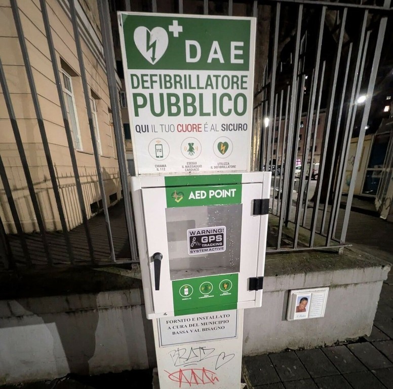 Il defibrillatore è stato recuperato e riposizionato in piazza Galileo Ferraris.