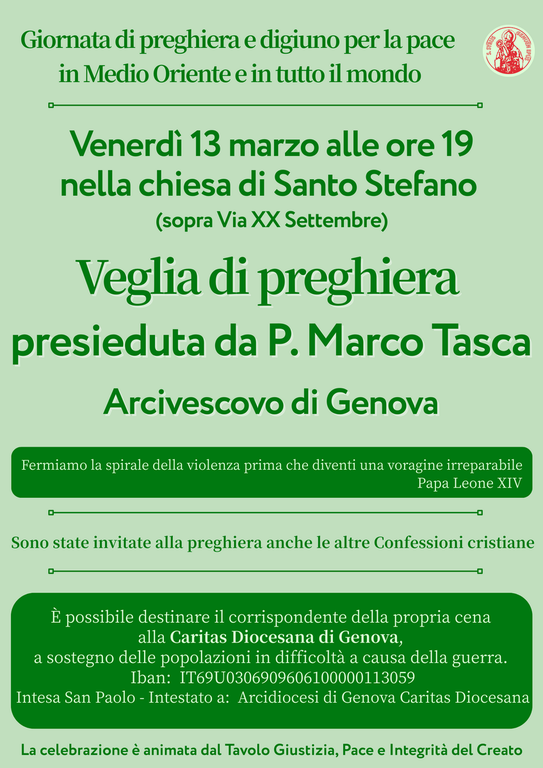 Nella Giornata di preghiera e digiuno promossa dalla Conferenza Episcopale Italiana, questa sera alle ore 19 nella Chiesa di Santo Stefano (sopra Via XX Settembre) Mons. Marco Tasca, Arcivescovo di Genova, presiede la Veglia diocesana per la pace.