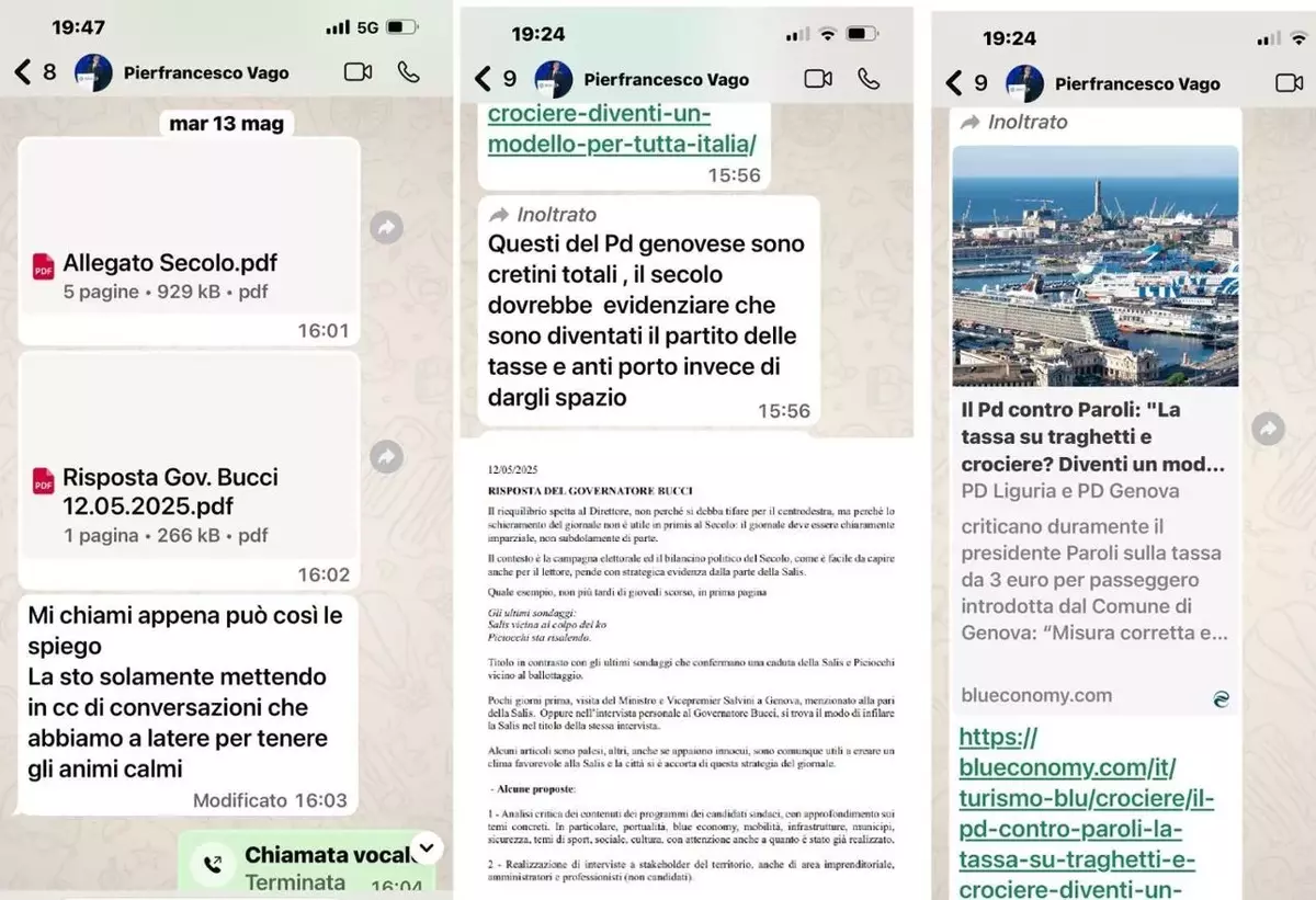 Poco dopo, sul Secolo XIX è stata pubblicata la replica del direttore Brambilla, che accusa il presidente della Regione di aver mentito in conferenza stampa sull’esistenza di un documento relativo alla campagna elettorale per le comunali del 2025 e di aver inviato pressioni all’editore del giornale. Per dimostrarlo ha diffuso alcuni screenshot di messaggi che, a suo dire, sarebbero stati inviati dal governatore proprio all’editore del quotidiano.