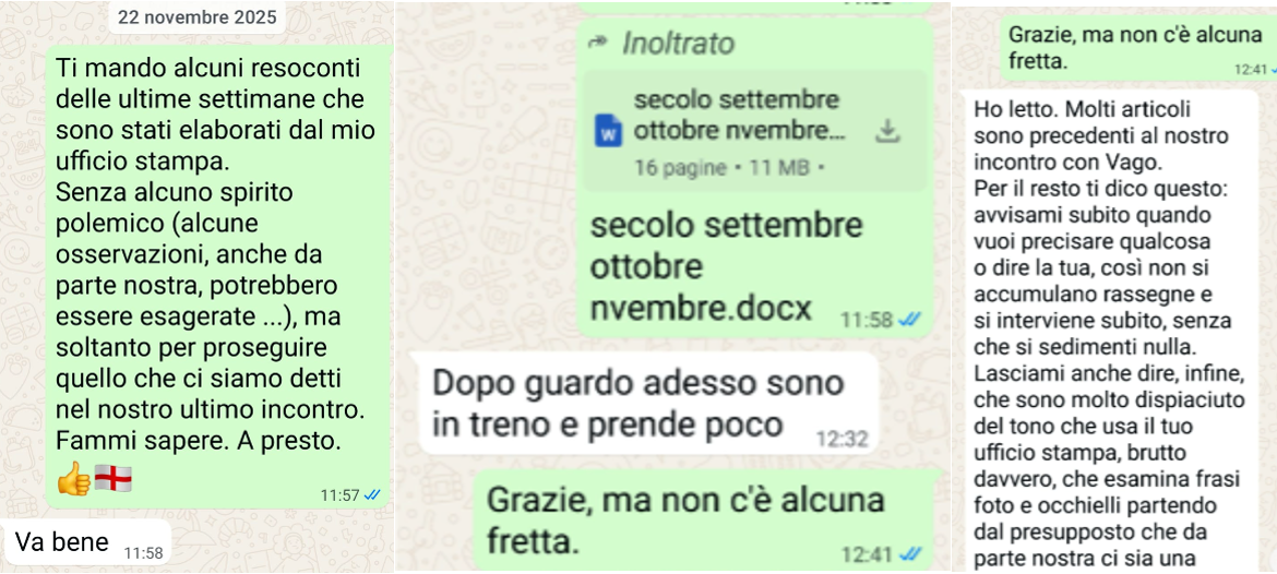 Torniamo poi a scambiarci messaggi dopo ben 5 mesi e con la massima cordialità. Il 22 novembre, invio al direttore alcuni resoconti e preciso di farlo “senza alcuno spirito polemico (alcune osservazioni, anche da parte nostra, potrebbero essere esagerate) ma soltanto per proseguire quello che ci siamo detti nel nostro ultimo incontro”. E il direttore mi risponde “Va bene, dopo guardo adesso sono in treno”. Dopo la lettura è lo stesso direttore che fa riferimento a un incontro avvenuto in sua presenza con l’editore: nessuna azione di pressione indebita, dunque. Il direttore mi chiede di avvisarlo subito, senza che si accumulino quelle che lui stesso correttamente definisce rassegne. Questo il testo preciso: “Per il resto ti dico questo: avvisami subito quando vuoi precisare qualcosa o dire la tua, così non si accumulano rassegne e si interviene subito, senza che si sedimenti nulla”.