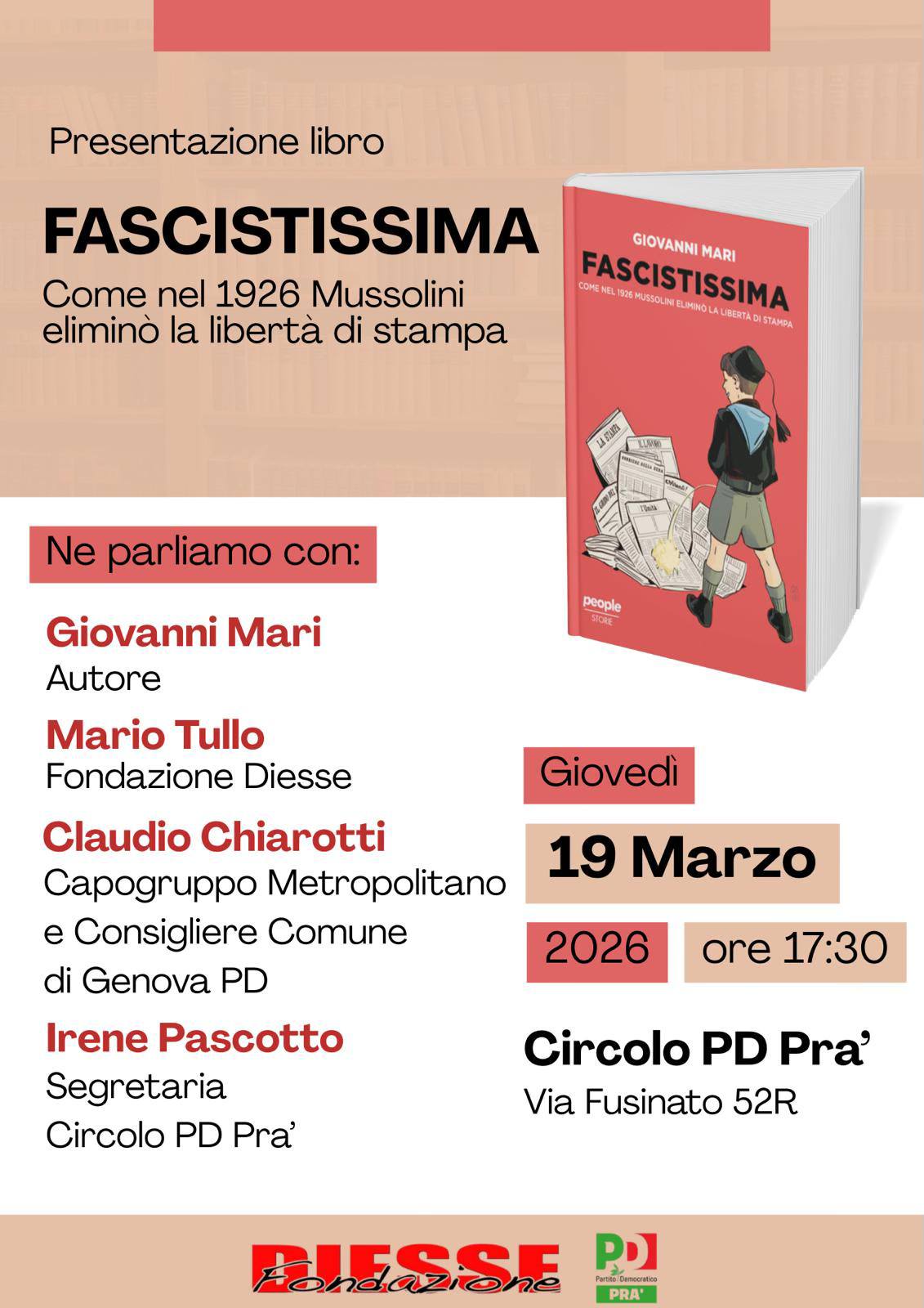 Il libro di Mari sarà presentato, direttamente dall’autore, giovedì 19 marzo, alle ore 17,30, presso il Circolo di Pra’ del Partito Democratico, in via Fusinato 52 rosso. Oltre a Mari, saranno presenti all’appuntamento anche la segretaria del circolo, Irene Pascotto, il consigliere comunale Claudio Chiarotti e l’ex deputato Mario Tullo, oggi esponente di spicco della Fondazione Diesse che organizza l’evento.