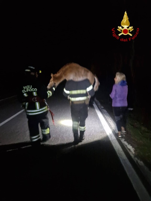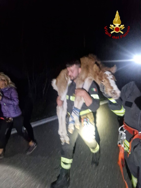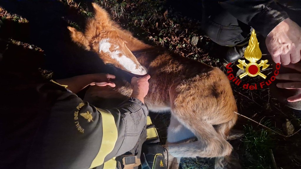 Una volta arrivati sul posto, i vigili del fuoco hanno immobilizzato con cautela le zampe del puledro utilizzando delle corde e gli hanno coperto gli occhi, una tecnica necessaria per mantenerlo calmo durante le operazioni. Da lì è iniziata la fase più delicata del recupero, conclusasi con il ritorno dell’animale in una zona sicura.