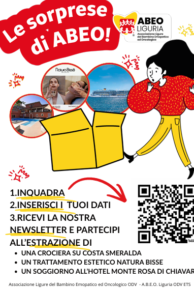 Partecipare è semplice: basta compilare il form online https://bit.ly/sorprese_abeo e iscriversi alla newsletter di ABEO Liguria seguendo le istruzioni. Tra tutti i nuovi iscritti, lunedì 4 maggio saranno estratti tre vincitori, che riceveranno i premi messi a disposizione grazie alla generosità di amici e sostenitori, tra cui una crociera di 7 giorni su Costa Smeralda, messa a disposizione da Costa Foundation.