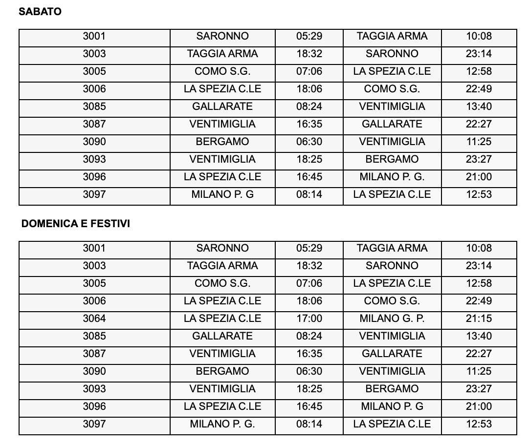 Nel dettaglio saranno 21 i Treni del mare, finanziati e programmati da Regione Liguria e Regione Lombardia in collaborazione con Trenitalia e Trenord, di cui 10 al sabato e 11 la domenica e i festivi fino al 27 settembre.
