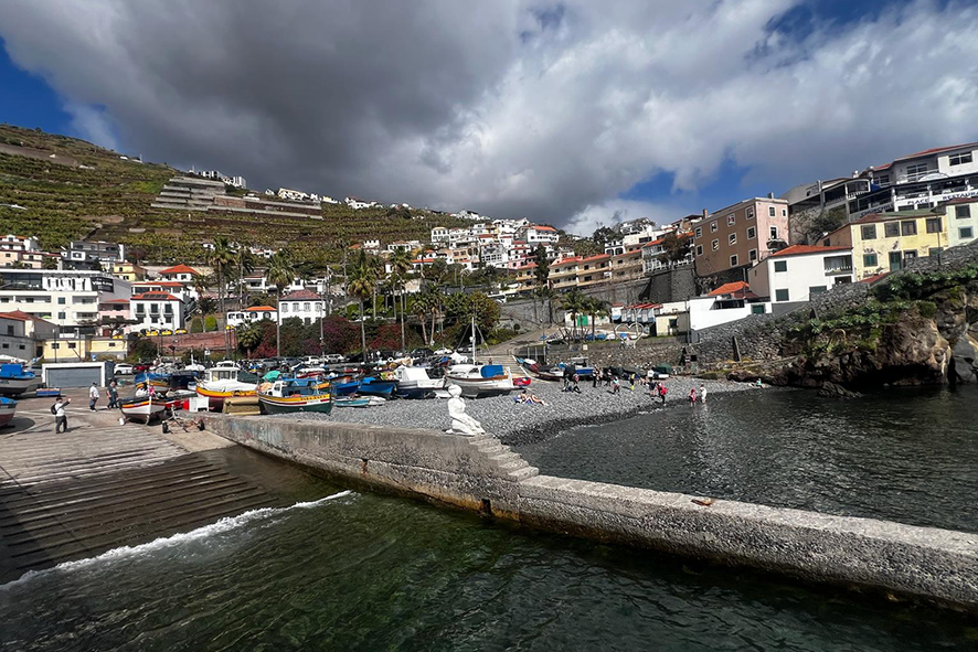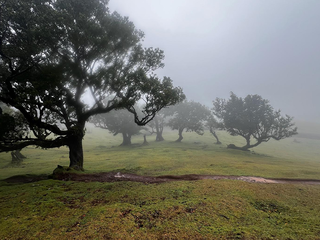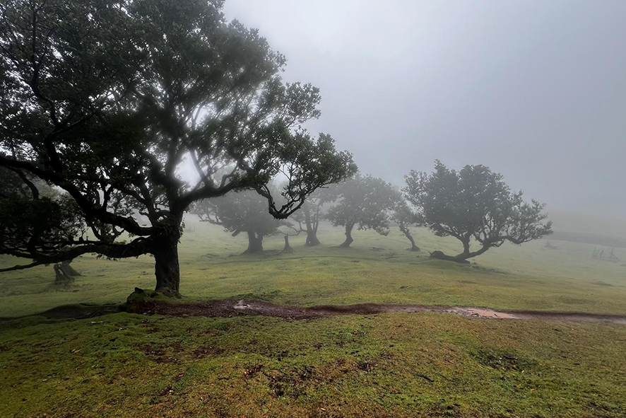 Câmara de Lobos, che è un borgo di pescatori essenziale ma autentico, uno di quei posti che non cercano di impressionare, ma finiscono per restarti dentro. Non ha nulla di spettacolare in senso classico, e forse è proprio questo il suo punto di forza: le persone, i ritmi lenti, i gesti quotidiani. Le barche colorate rientrano nel porto, i pescatori sistemano le reti e la vita scorre con una naturalezza disarmante. Ricordo i signori seduti a giocare a carte, le voci basse, le risate improvvise e il sole che finalmente arrivava dopo giorni di nebbia, quasi come una ricompensa. Era tutto estremamente vero, privo di costruzioni per il turista. E poi la Foresta di Fanal a 1200 metri s.l.m, che sembra appartenere a un’altra dimensione. È una distesa di alberi e pascoli di montagna, ma è la nebbia a definirne davvero l’identità. Quando ci siamo andati pioveva, c’era fango e la visibilità era ridotta, eppure era proprio questo a renderla così affascinante. Un po’ come essere in una fiaba.