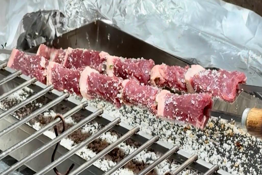 Partivamo con l’idea di un luogo legato soprattutto al pesce — e solo in parte è così — ma ciò che ci ha sorpreso è stata la centralità della carne nella cucina locale. In particolare, le “Espetadas”: grandi spiedini infilzati su rami di alloro e cotti alla brace, che rendono la carne succosa e profumata. Accanto, quasi immancabile, c’è il bolo do caco: un pane morbido, leggermente tostato, condito con burro, aglio e prezzemolo. Semplice ma molto sfizioso. E poi le patate, sempre presenti, spesso schiacciate o arrostite, a completare il piatto. È una cucina che non cerca effetti speciali, ma conquista per autenticità e gusti inaspettati.