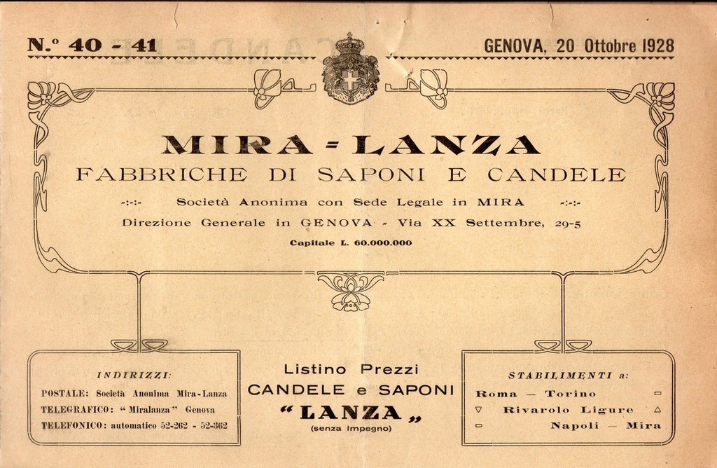La storia della Mira Lanza inizia alla fine dell’Ottocento, in piena espansione industriale. In città stavano nascendo diverse produzioni antesignane dei grandi stabilimenti. Nel 1873 Erasmo Piaggio e Luigi Bottaro fondano a Genova la “Fabbrica Candele Steariche, Sapone e Acido Solforico L. Bottaro e C.” destinata a diventare nel tempo le Stearinerie Italiane.