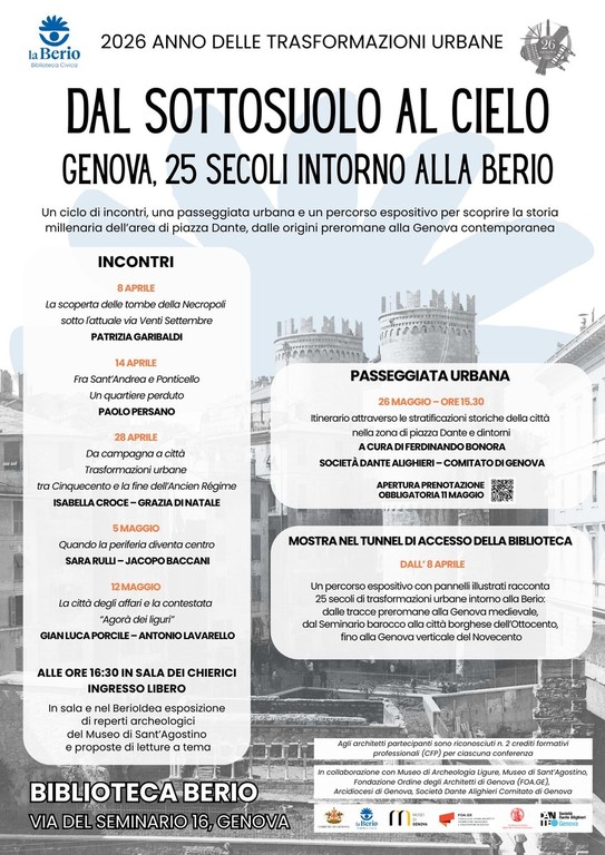 Un percorso che attraversa i secoli, dalle tracce preromane fino alla città contemporanea, per raccontare come si è trasformata l’area di piazza Dante. È questo il cuore del progetto “Dal sottosuolo al cielo: Genova, 25 secoli intorno alla Berio”, promosso dalla Biblioteca Berio nell’ambito del 2026 dedicato alle trasformazioni urbane.