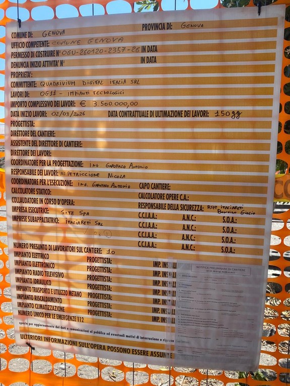 Contrariamente a quanto ipotizzato inizialmente, non si tratta di un cantiere comunale, ma di un'opera strategica in carico alla società Quadridium Digital. Il progetto prevede la posa di cavi sottomarini che collegheranno la spiaggia di Sturla al data center situato in via Isonzo 21. L'intervento fa parte del progetto di efficientamento della rete elettrica gestito da E-Distribuzione, che sta potenziando le cabine di media tensione in tutto il territorio cittadino.
