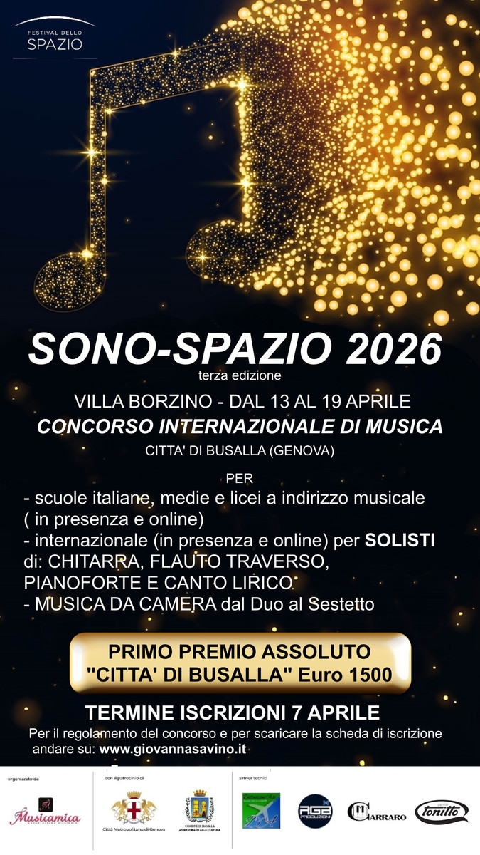 Imminente è l’avvio della 3° edizione del Concorso Internazionale di Musica Città di Busalla “Sono-Spazio 2026" che in questi anni è cresciuto portando con sé musicisti nostrani ed anche esteri, tutti di altissimo livello. Con l'intento di promuovere cultura, giovani talenti e diffondere la musica anche e soprattutto attraverso il nostro territorio, Associazione Musicamica rappresentata dalla sua presidentessa Giovanna Savino, è orgogliosa di presentare l’evento ufficialmente.
