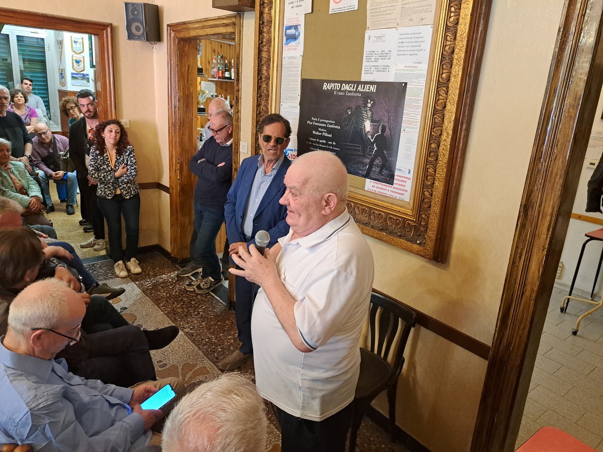 Sala stracolma a Sestri Ponente, presso la sede della Ucam - Unione Camminatori Amici della Montagna di via Ciro Menotti, per l’incontro svoltosi nei giorni scorsi con Fortunato Zanfretta, l’ex guardia giurata che, nel 1978, affermò di aver avuto un incontro ravvicinato con gli alieni, nei boschi vicini a Torriglia.