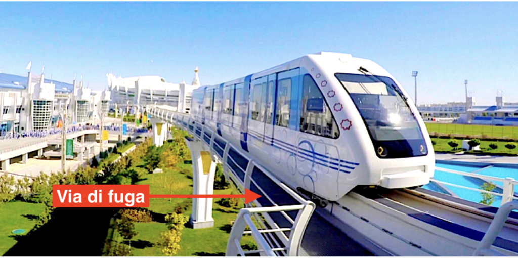 De Simone solleva inoltre dubbi sulla sicurezza delle funivie in ambito urbano. Citando il caso di Colonia, ricorda come “in caso di guasto i passeggeri possano restare bloccati per ore prima di essere evacuati con elicotteri o squadre speciali”. La monorotaia proposta prevede invece una passerella laterale di evacuazione lungo tutta la linea e uscite di sicurezza ogni 500 metri: “In caso di emergenza o di presenza di malintenzionati a bordo, le porte si aprono automaticamente e i passeggeri possono raggiungere terra in pochi minuti percorrendo al massimo 250 metri”.