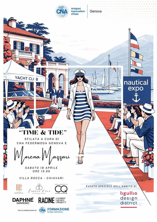 Sarà la sfilata “Time and Tide”, promossa da CNA Federmoda Genova e curata da Morena Mazzari, ad aprire ufficialmente il Tigullio Design District, la cui quinta edizione si svolgerà dal 20 al 26 aprile nel Golfo del Tigullio. Un evento internazionale diffuso, organizzato dall'associazione culturale Liguria Design, che, in parallelo alla Design Week di Milano, costruisce un ideale “ponte sul mare” tra i due appuntamenti, posizionando la Liguria come distretto creativo complementare al capoluogo lombardo.
