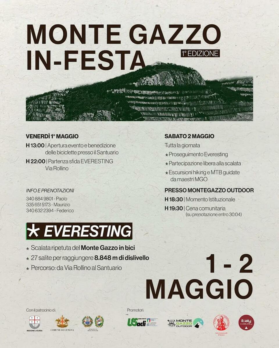 Debutta la prima edizione di “Monte Gazzo In-Festa”, la due giorni di sport e comunità in programma il 1° e 2 maggio sul Monte Gazzo, presentata in Sala Trasparenza di Regione Liguria. Un’iniziativa che, per la prima volta a Genova, porta anche una prova di “Everesting”, disciplina che prevede la ripetizione di una salita fino a raggiungere il dislivello complessivo dell’Everest, pari a 8.848 metri.