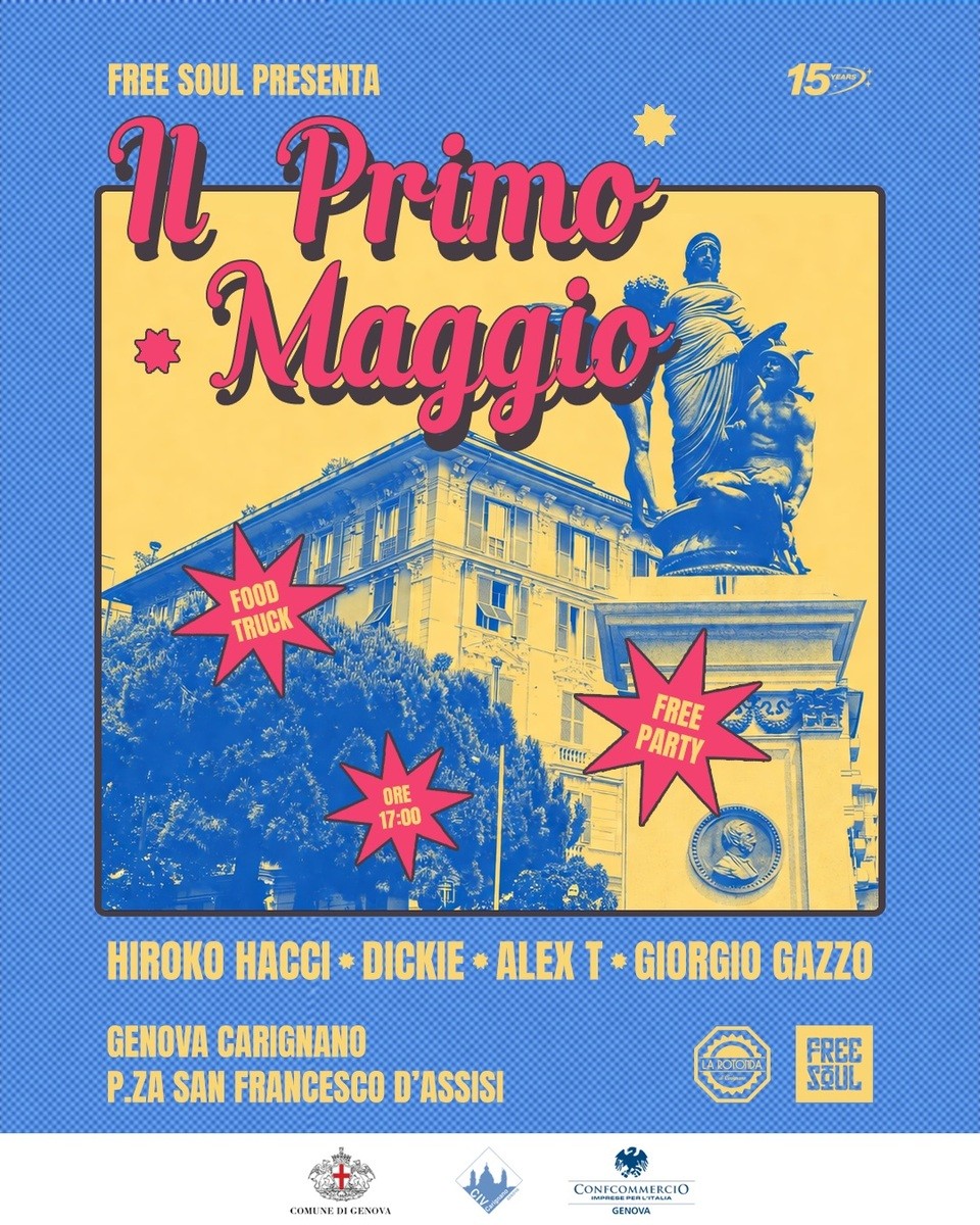Venerdì 1° maggio il collettivo Free Soul anima piazzale San Francesco d’Assisi, a Genova, con un evento open air a ingresso gratuito: dalle 17 musica elettronica, food truck e dj set con Hiroko Hacci, Dickie, Alex T e Giorgio Gazzo, per una serata di aggregazione nel cuore del quartiere.