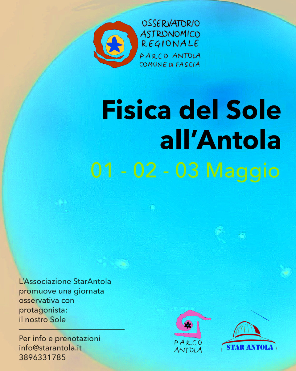 All’Osservatorio Astronomico del Parco dell’Antola torna un appuntamento speciale dedicato al Sole: da venerdì 1 a domenica 3 maggio visite guidate pomeridiane (ore 15 e 17) per osservare macchie solari e fenomeni della nostra stella, in un’esperienza divulgativa aperta a tutte le età.
